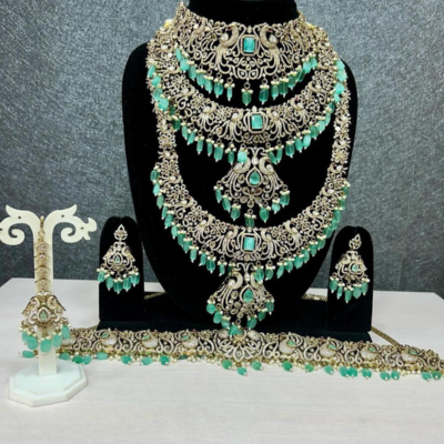Stunning emerald diamond jewellery set for rent, perfect for traditional weddings. Elevate your bridal look with regal elegance and charm.