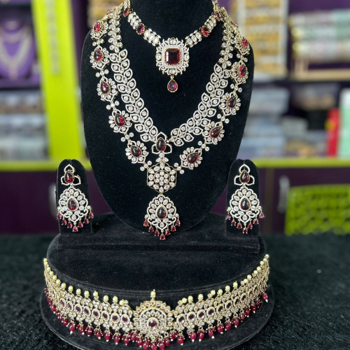Unique Maroon Victorian minimal jewellery set for rent, perfect for traditional weddings. Elevate your bridal look with regal elegance and charm.