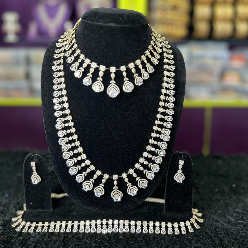 Moissanite minimal neckpiece in full white stones bridal jewellery set for rent, ideal for weddings, receptions, and photoshoots. Add timeless charm to your special day.