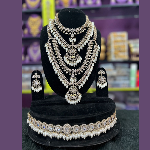 Unique Full white Victorian with moissanite jewellery set for rent, perfect for traditional weddings. Elevate your bridal look with regal elegance and charm.