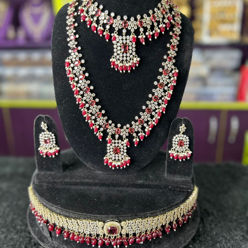 Unique Maroon Victorian minimal jewellery set for rent, perfect for traditional weddings. Elevate your bridal look with regal elegance and charm.
